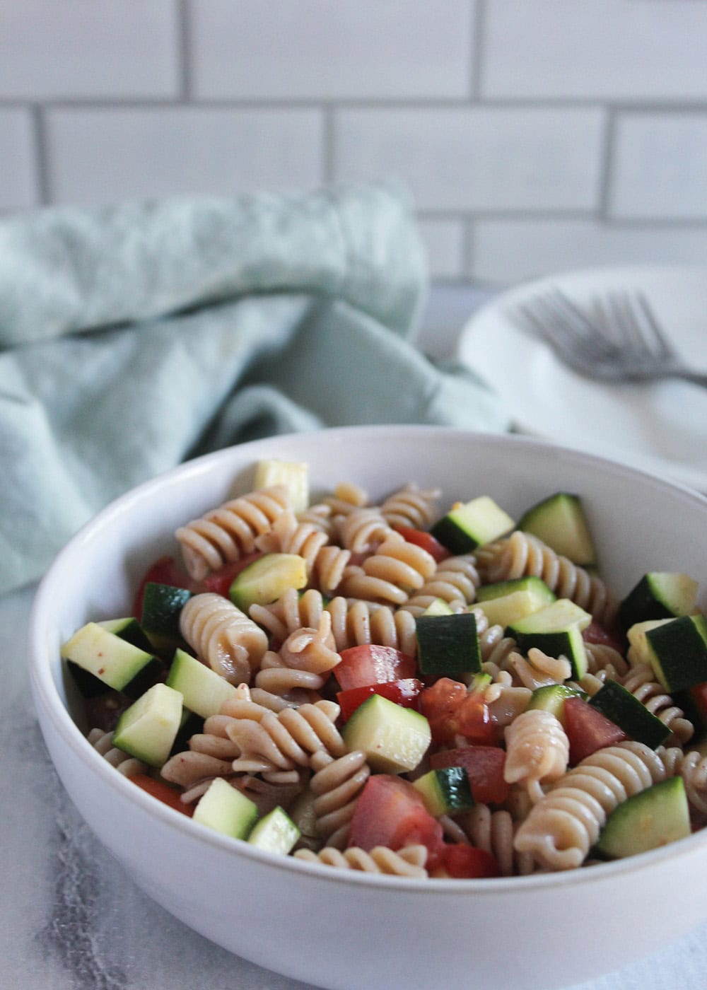 This 4 ingredient pasta salad is an easy pasta salad that’s made with crisp zucchini and juicy tomatoes tossed with al dente pasta and zesty Italian dressing. Each bite is bright, colorful, and can be ready in under 20 minutes. It’s fast, filling and foolproof.